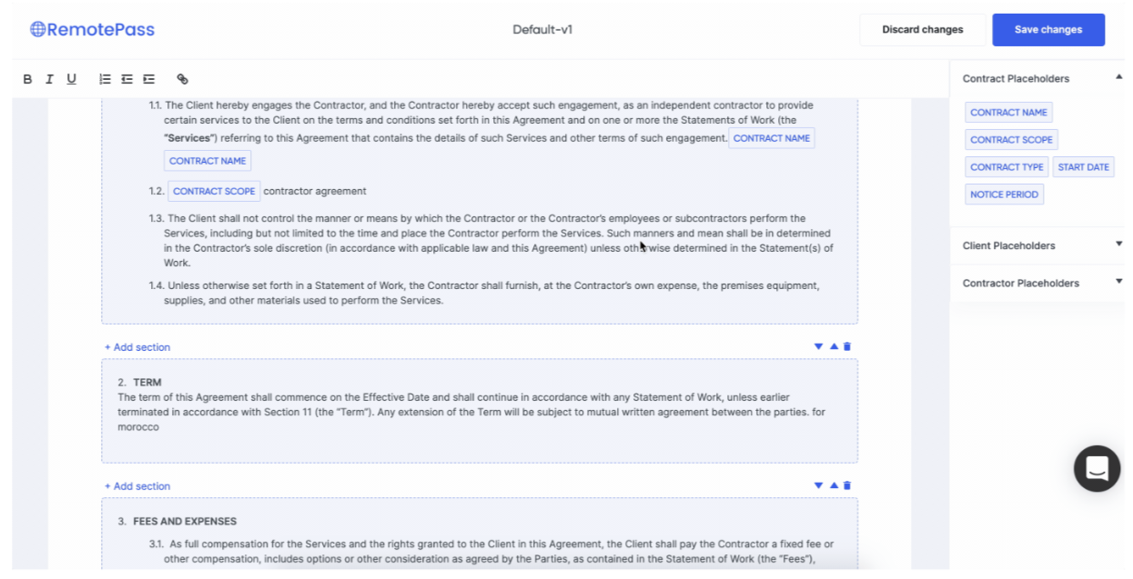 - Compliant contract generation: Creates locally compliant contractor agreements directly within the platform.