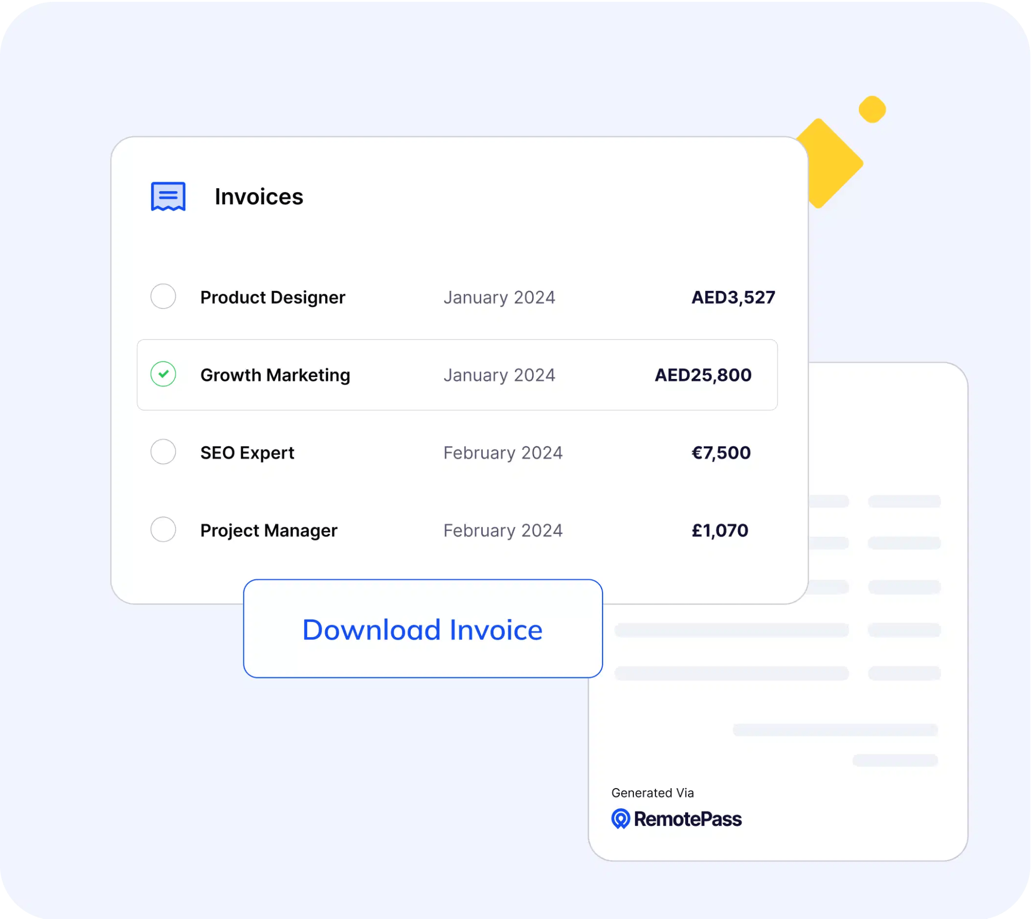 When a contractor completes work, RemotePass automatically generates compliant invoices in the correct format for their country. No more chasing 50 different people.
