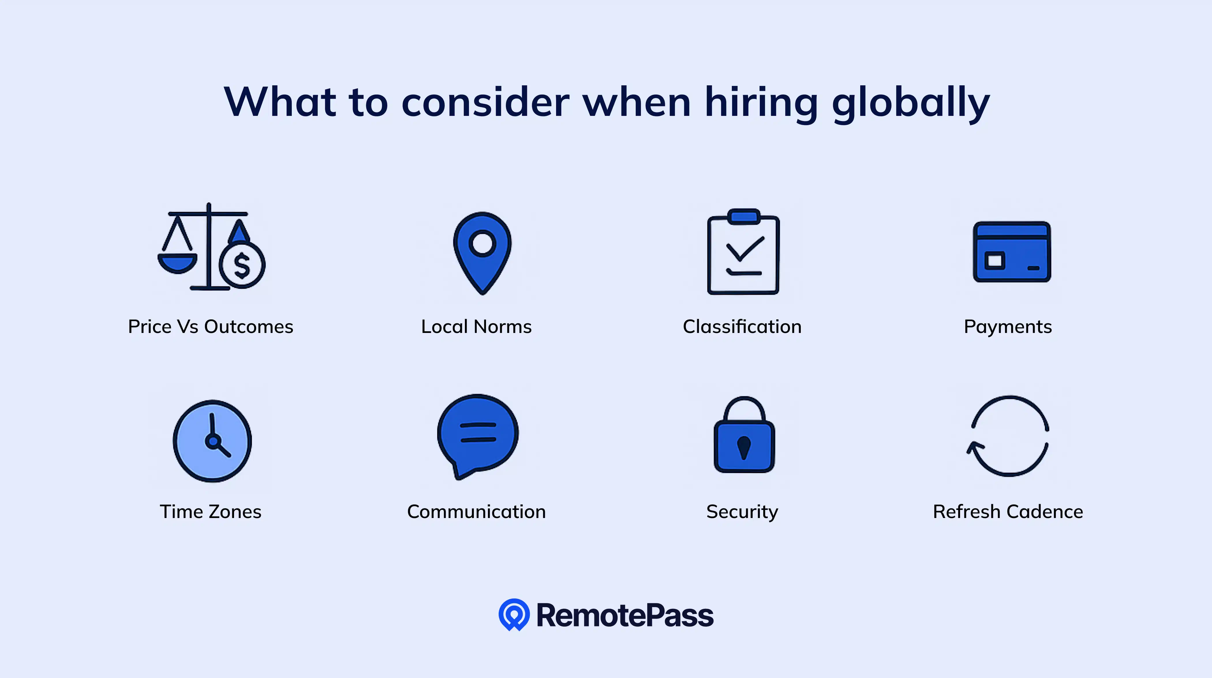 Want to see how your current pipeline maps to fair local rates and the right engagement type? Book a RemotePass demo. We’ll walk through your roles, propose a clean workflow, and show total cost before you commit.