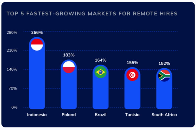 - Hiring volume in Indonesia grew 266% year-over-year, Poland 183%, and Brazil 164%.