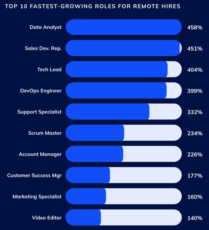 - Data Analyst hiring grew 458%. SDR hiring grew 451%. Tech Lead hiring grew 404%.