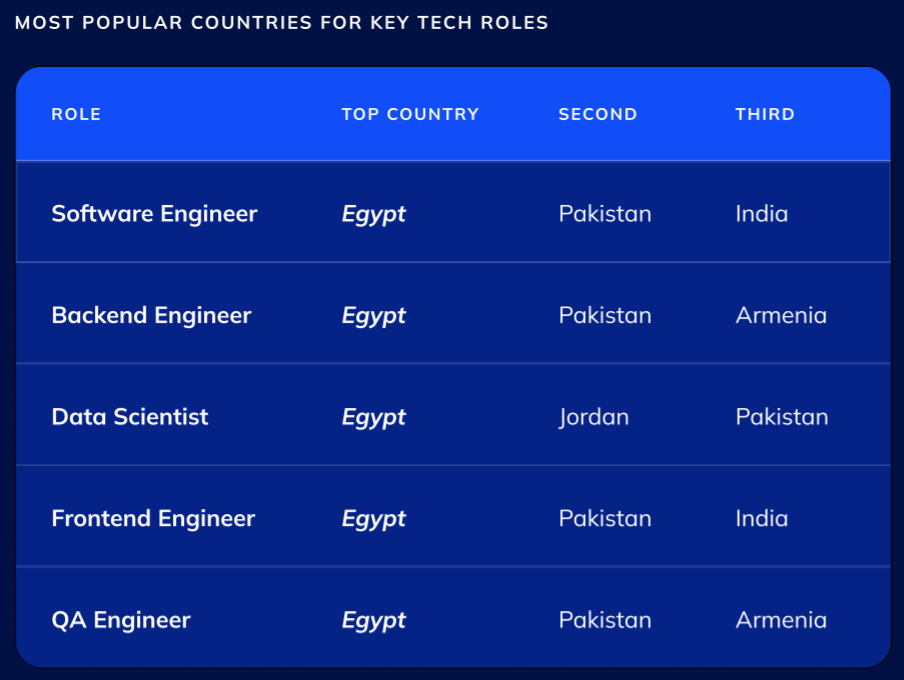 - Egypt ranks #1 for Software Engineers, Backend Engineers, Data Scientists, Frontend Engineers, and QA Engineers.
