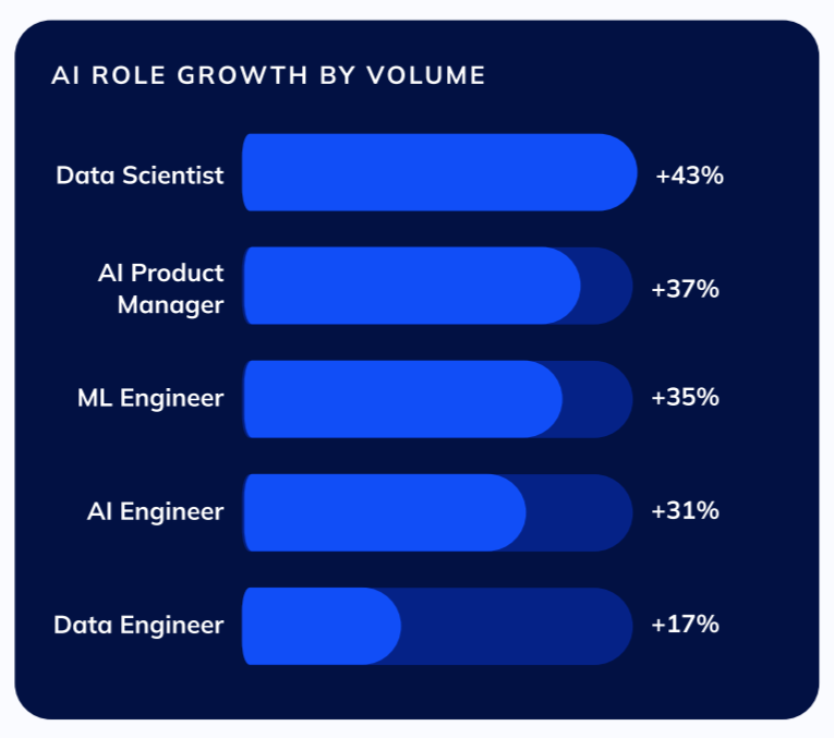 - Data Scientist roles grew 43%. AI Product Manager roles grew 37%. ML Engineer roles grew 35%.